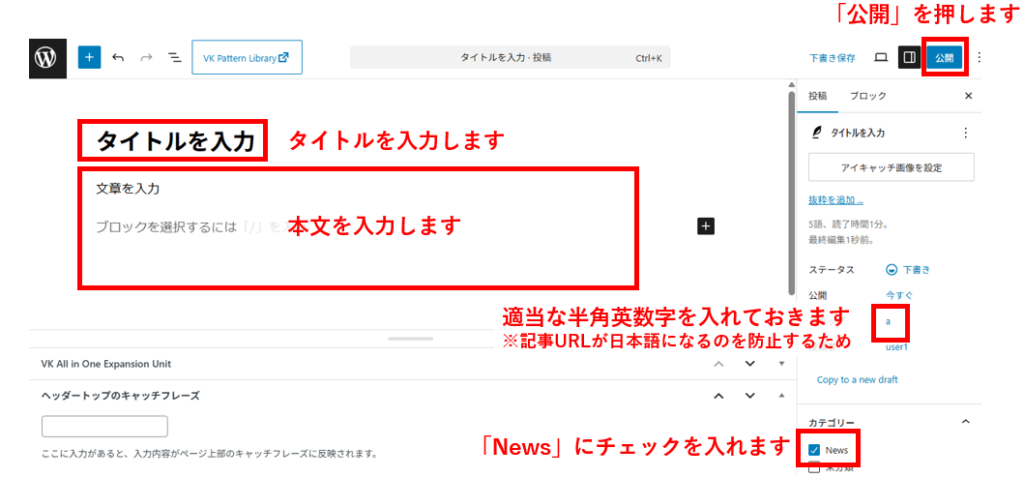 サイト上部の新着NEWS一覧に表示させる方法を説明します。