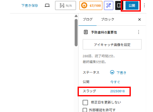 スラッグに半角英数字で適当な文字列(本日の日付など)を入力し、「公開」を押します。